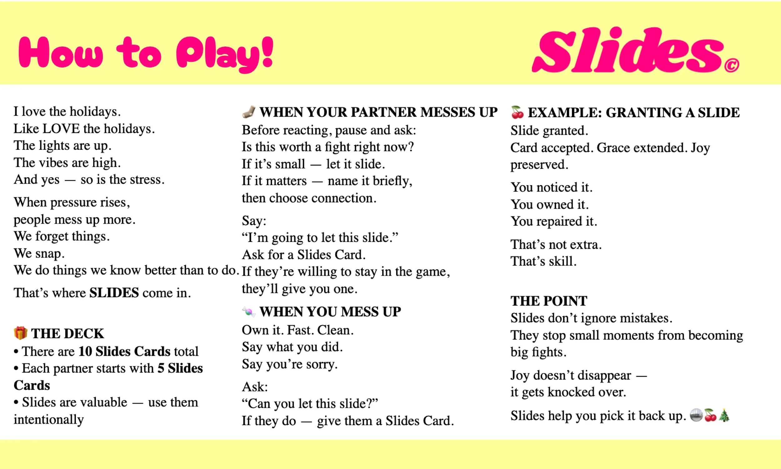 SLIDES are a CouplesTherapy.co concept designed to help couples stay connected when people are imperfect